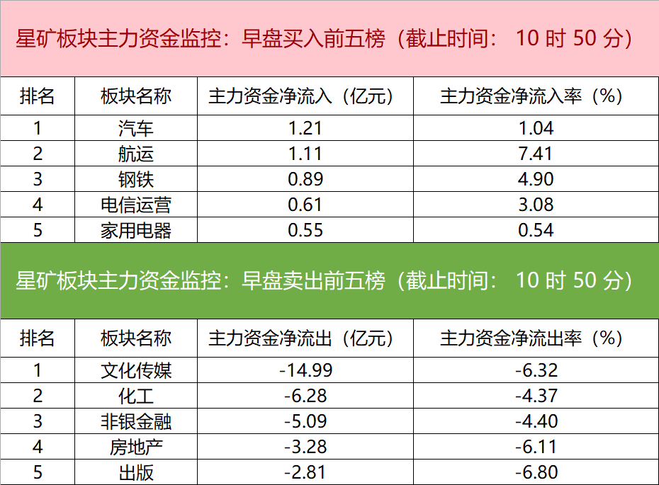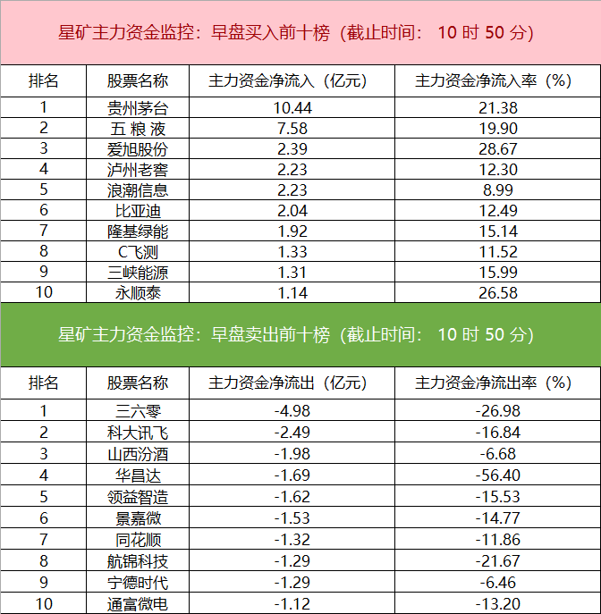 财联社5月22日电,财联社星矿数据显示,今日早盘主力资金净流入汽车、航运、钢铁等板块,净流出文化传媒、化工、非银金融等板块,其中净流出文化传媒板块超14亿元。个股方面,贵州茅台上涨,主力资金净买入10.44亿元,五粮液、爱旭股份、泸州老窖获主力资金净流入居前;三六零遭净卖出超4亿元,科大讯飞、山西汾酒、华昌达主力资金净流出额居前。