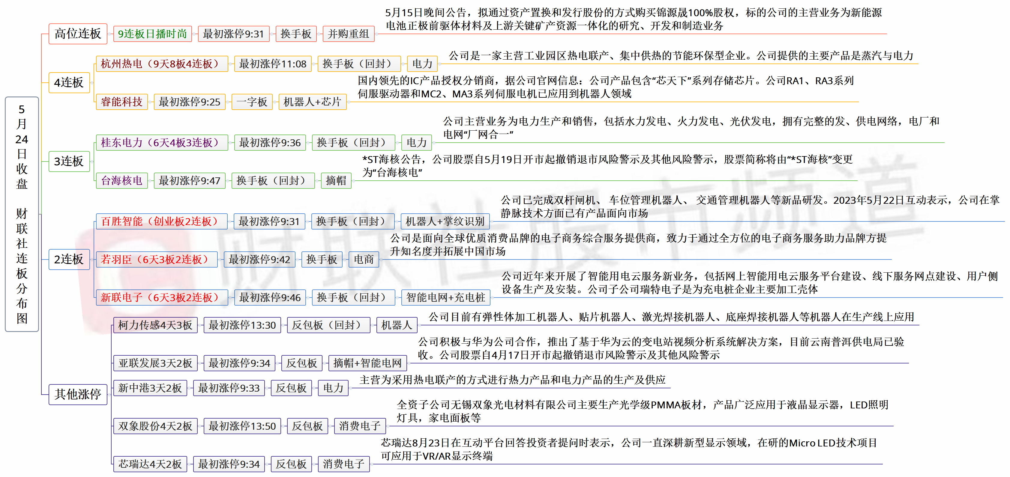 今日共42股涨停,连板股总数8只,其中三连板及以上个股5只,上一交易日共8只连板股,连板股晋级率62.50%(不含ST股、退市股及未开板新股)。个股方面,市场继续演绎小票连板风格,活跃资金热衷于“炒新(次新)”、“炒妖(连板)”、“炒差(ST及摘帽)”以及20CM个股(全天11只20CM个股涨停)。行情的“三只箭头”仍未熄火,日播时尚缩量加速晋级9连板,杭州热电9天8板,丰立智能再度大涨17%,5天暴涨超140%。板块方面,“中特估”领跌两市,拖累指数下行,中国银行、中国石化等龙头相继破位;市场轮动加速,机器人、芯片产业链、电力产业链、新能源赛道、AI应用及CPO盘中皆有表现,但多数冲高回落,操作难度极大。