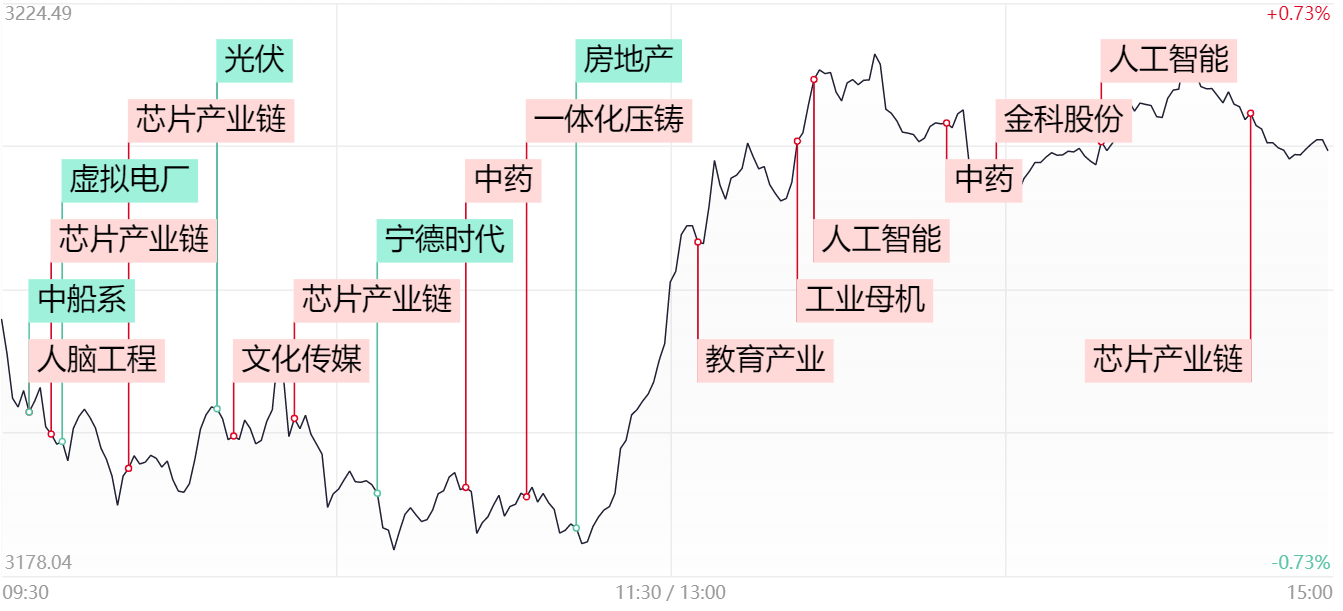 上个交易日,三大股指全线低开,新能源赛道震荡走弱拖累创业板指一度跌超1%并创出1年以来新低。临近收盘前汽车零部件以及大金融、中字头板块拉升助沪指站稳3200点整数关。AI和算力概念全天表现活跃,科创50指数大涨1.66%。沪深两市成交额8205亿,缩量364亿。1)算力概念延续大涨势头,算力芯片、存储芯片、服务器等分支全面开花,睿能科技6连板,金百泽、鸿博股份2连板,胜宏科技、拓维信息、华胜天成、超讯通信、德明利、恒烁股份涨停,寒武纪、光库科技、朗科科技等涨超10%。中邮证券5月26日研报表示,英伟达业绩及与指引超预期,体现的是AI算力基础设施现阶段和未来的高景气。2)传媒、教育、游戏等AI应用方向大面积展开修复,南方传媒、长江传媒、名臣健康、学大教育、凯文教育、天地在线、中公教育涨停,紫天科技、果麦文化、科德教育、盛天网络、创业黑马大涨超10%。3)数据要素、数据安全方向表现不俗,金桥信息8天5板,智度股份、吉大正元涨停,云创数据、中富通等涨超10%。消息面上,近日,多地先后发生不法分子利用人工智能(AI)进行诈骗,涉及金额数百万元。4)水利建设、水务板块早盘大涨,浙江建投2连板,深水规院、国统股份、三和管桩、联合水务、钱江水利、韩建河山涨停,冠龙节能涨超10%。消息面上,中央、国务院印发《国家水网建设规划纲要》,明确要加快构建国家水网。