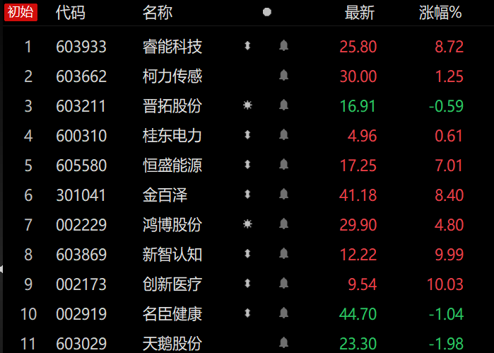 财联社5月30日电,市场焦点股睿能科技(7板)高开8.72%,机器人板块柯力传感(7天4板)高开1.25%、晋拓股份(6天3板)低开0.59%,电力股桂东电力(9天6板)高开0.61%、恒盛能源(4板)高开7.01%,算力板块金百泽(创业板3板)高开8.40%、鸿博股份(3板)高开4.80%,脑机接口概念股新智认知(2板)竞价涨停、创新医疗(2板)竞价涨停,游戏股名臣健康(8天4板)低开1.04%,供销社概念股天鹅股份(6天3板)低开1.98%。