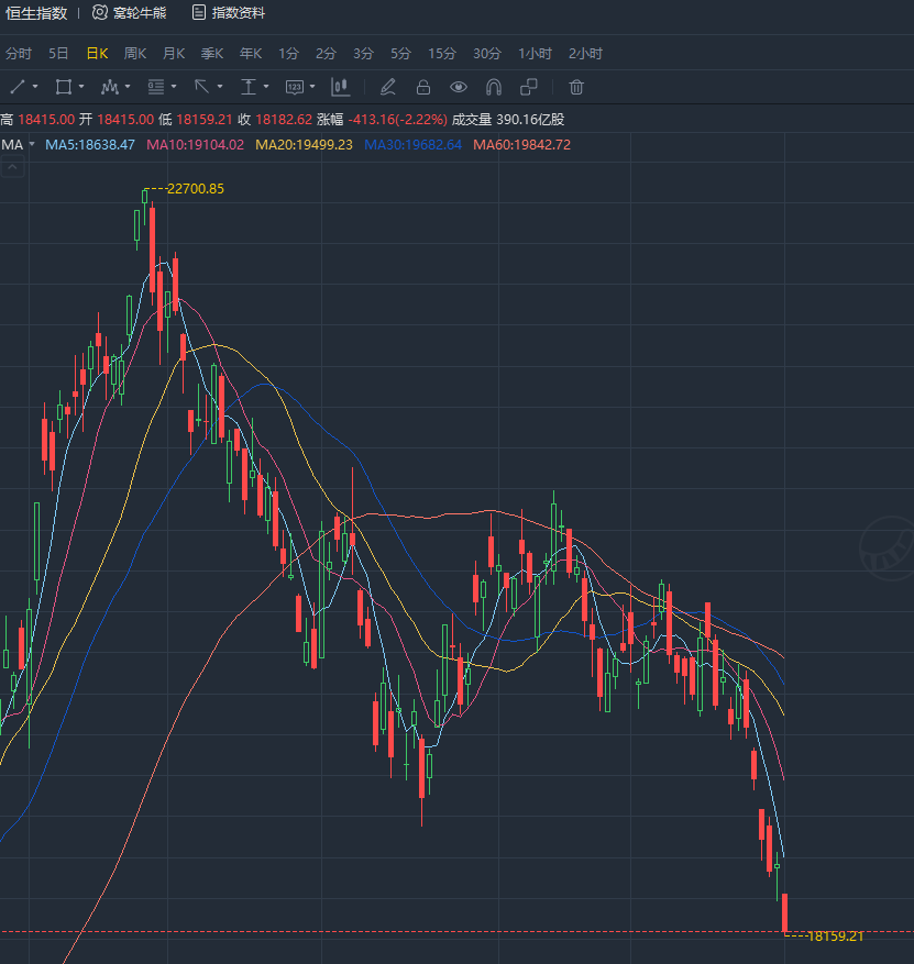 财联社5月31日电,香港恒生指数日内跌2.3%,较1月高位回落20%,料将迈入技术性熊市。
