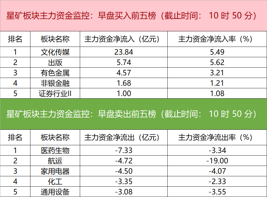 财联社6月1日电,财联社星矿数据显示,今日早盘主力资金净流入文化传媒、出版、有色金属等板块,净流出医药生物、航运、家用电器等板块,其中净流入文化传媒板块超23亿元。个股方面,科大讯飞涨停,主力资金净买入10.29亿元,世纪华通、立讯精密、三六零获主力资金净流入居前;新智认知遭净卖出超2亿元,英飞拓、鸿博股份、深科技主力资金净流出额居前。