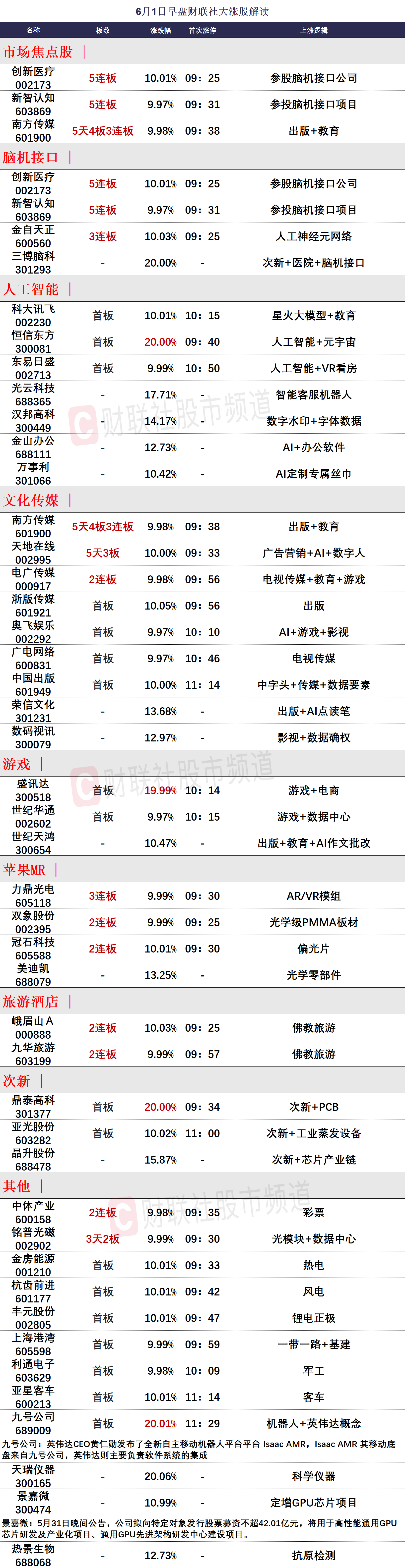 今日午盘两市共31股涨停,连板股总数11只,12股封板未遂,封板率为72%(不含ST股、退市股及未开板新股)。个股方面,脑机接口概念股新智认知5板、创新医疗5板、金自天正3板,文化传媒板块南方传媒5天4板、天地在线5天3板、电广传媒2板,苹果MR概念股力鼎光电3板、双象股份2板。