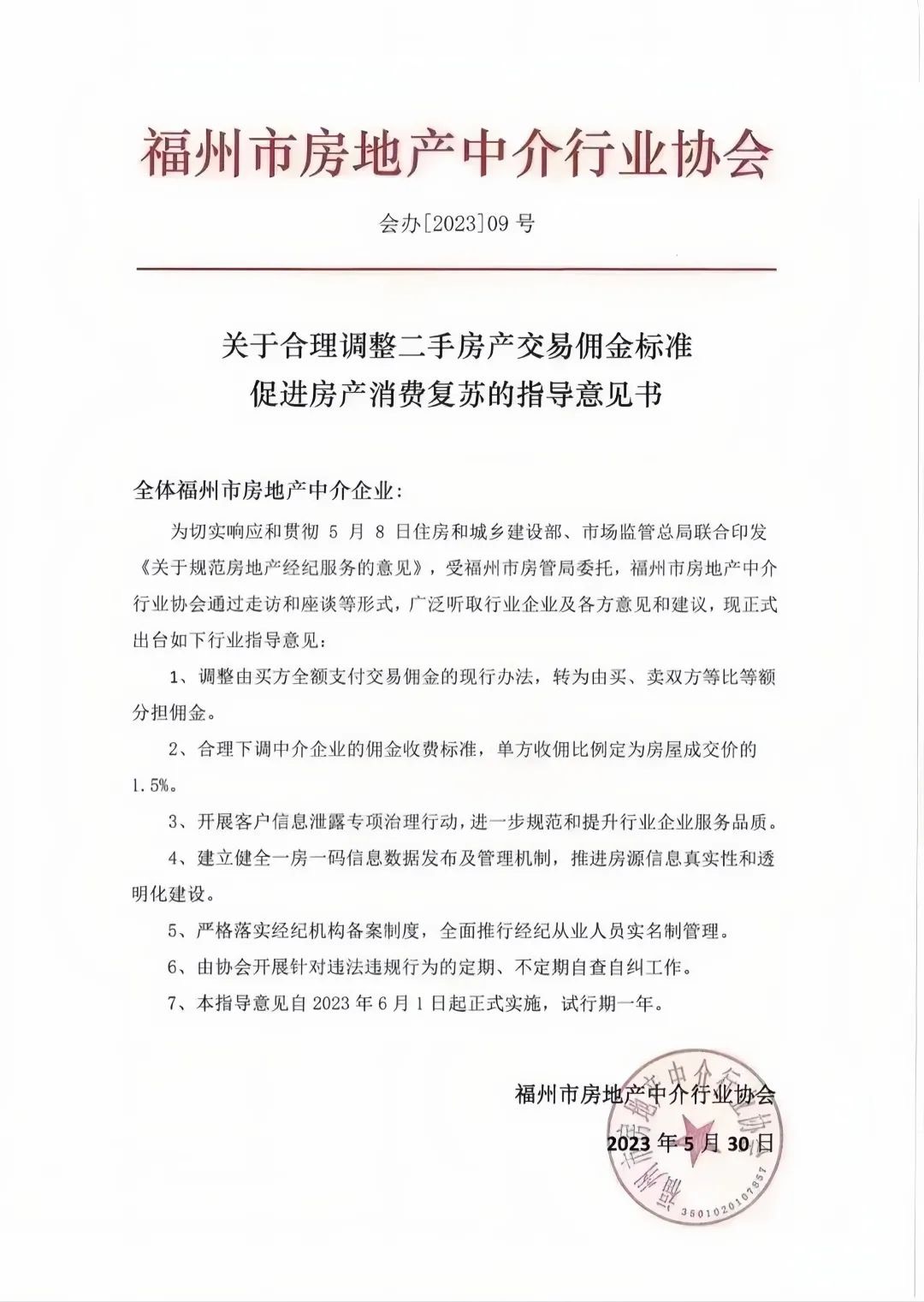 财联社6月1日电,记者获悉,福州市房地产中介行业协会日前发布了《关于合理调整二手房产交易佣金标准促进房产消费复苏的指导意见书》,指导意见书称,调整由买方全额支付交易佣金的现行办法,转为由买、卖双方等比等额分担佣金;合理下调中介企业的佣金收费标准,单方收佣比例定为房屋成交价的1.5%,指导意见自2023年6月1日起正式实施,试行期一年。(财联社记者 陈业 王海春)