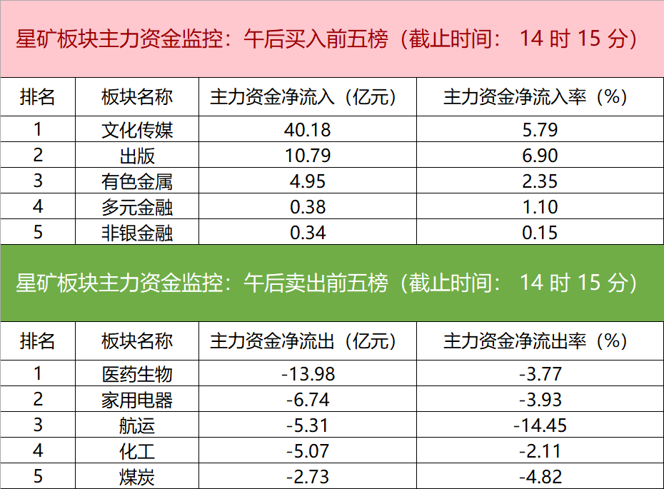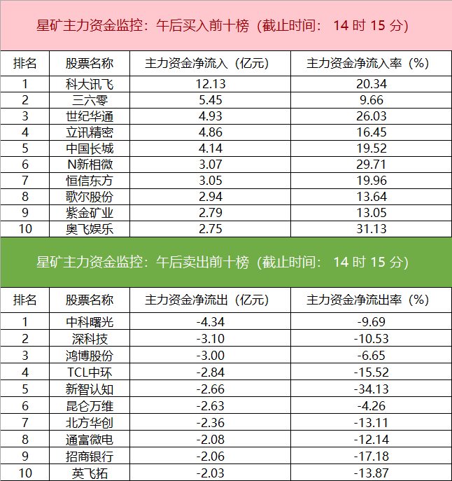 财联社6月1日电,财联社星矿数据显示,今日主力资金净流入文化传媒、出版、有色金属等板块,净流出医药生物、家用电器、航运等板块,其中文化传媒板块净流入40.18亿。个股方面,科大讯飞涨停,主力资金净买入12.13亿元,三六零、世纪华通、立讯精密等获主力资金净流入居前;中科曙光遭净卖出超4亿,深科技、鸿博股份、TCL中环等主力资金净流出额居前。