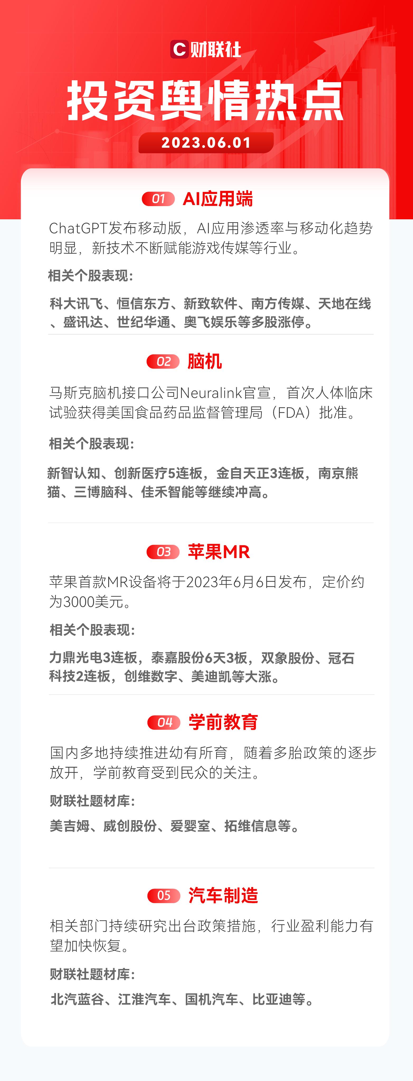 2)脑机:马斯克脑机接口公司Neuralink官宣,首次人体临床试验获得美国食品药品监督管理局(FDA)批准;