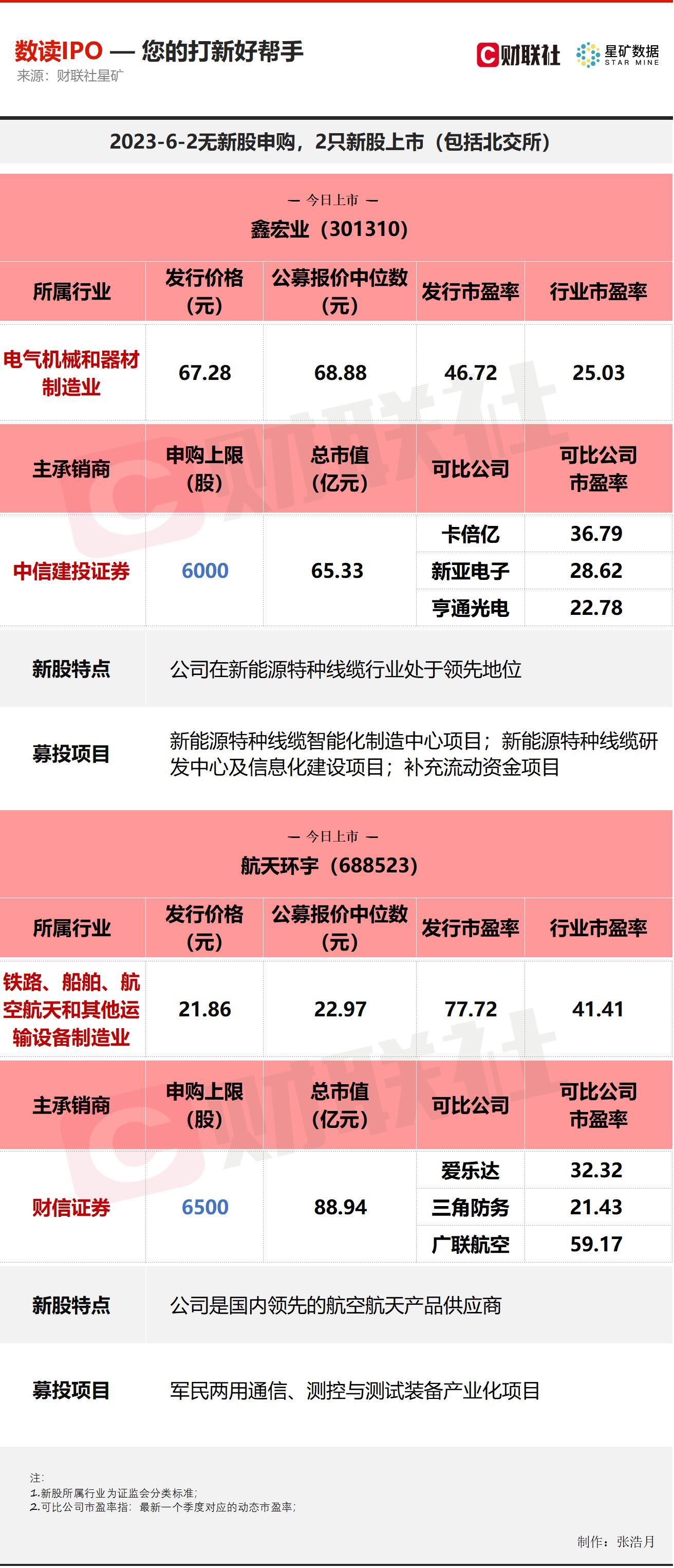 财联社6月2日电,今日无新股申购;2只新股上市,分别为创业板的鑫宏业,科创板的航天环宇。