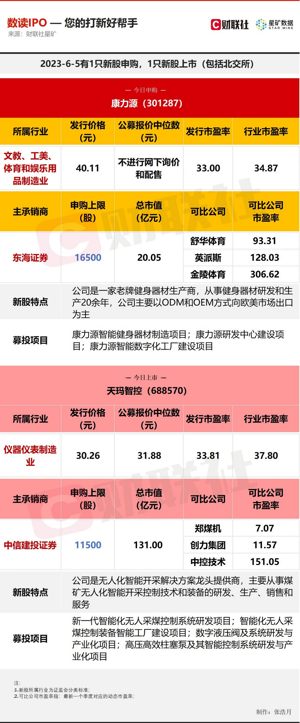 财联社6月5日电,今日1只新股申购,为创业板的康力源;1只新股上市,为科创板的天玛智控。