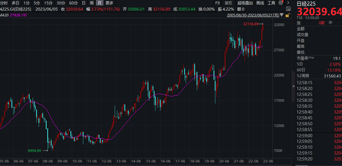 财联社6月5日电,日经225指数涨幅一度扩大至2%,报32157点,续刷1990年以来新高。