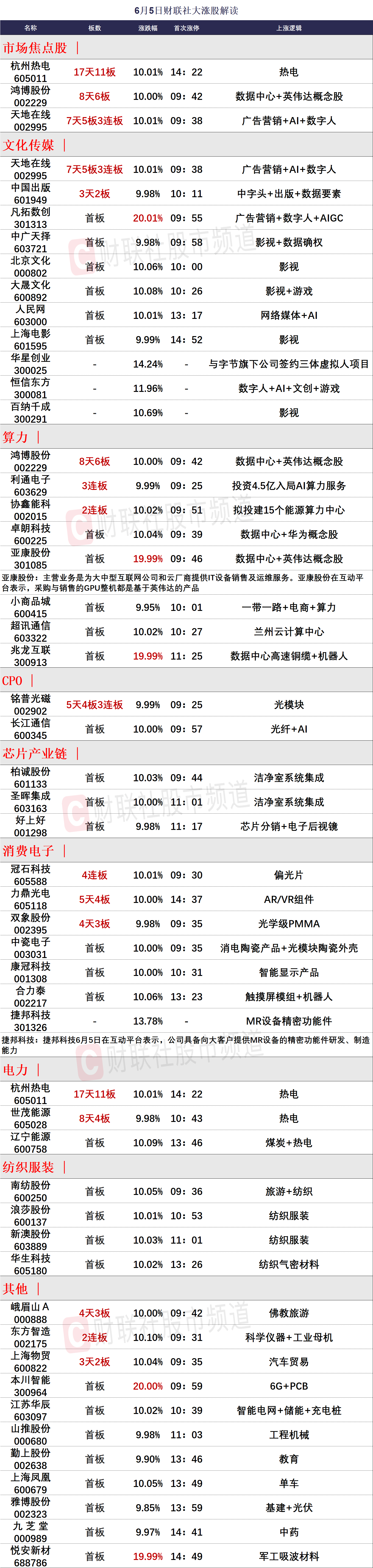 今日共45股涨停,连板股总数6只,7股封板未遂,封板率为86%(不含ST股、退市股及未开板新股)。个股方面,电力股杭州热电17天11板、世茂能源8天4板,算力板块鸿博股份8天6板、利通电子3板,传媒股天地在线7天5板、中国出版3天2板,消费电子板块冠石科技4板、力鼎光电5天4板、双象股份4天3板,CPO概念股铭普光磁5天4板,旅游股峨眉山A4天3板。今日收涨个股2609只,收跌个股2160只。