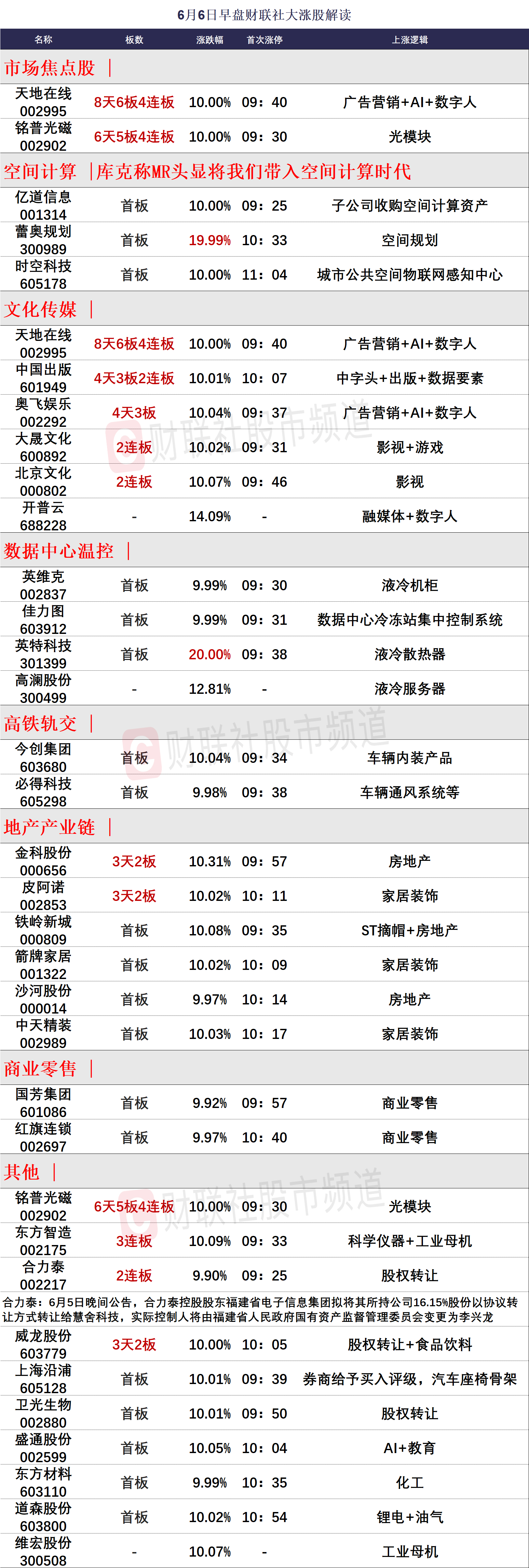 今日午盘两市共30股涨停,连板股总数7只,8股封板未遂,封板率为79%(不含ST股、退市股及未开板新股)。个股方面,传媒板块天地在线8天6板、中国出版4天3板、奥飞娱乐4天3板,CPO概念股铭普光磁6天5板,工业母机概念股东方智造3板,地产产业链的金科股份3天2板、皮阿诺3天2板。
