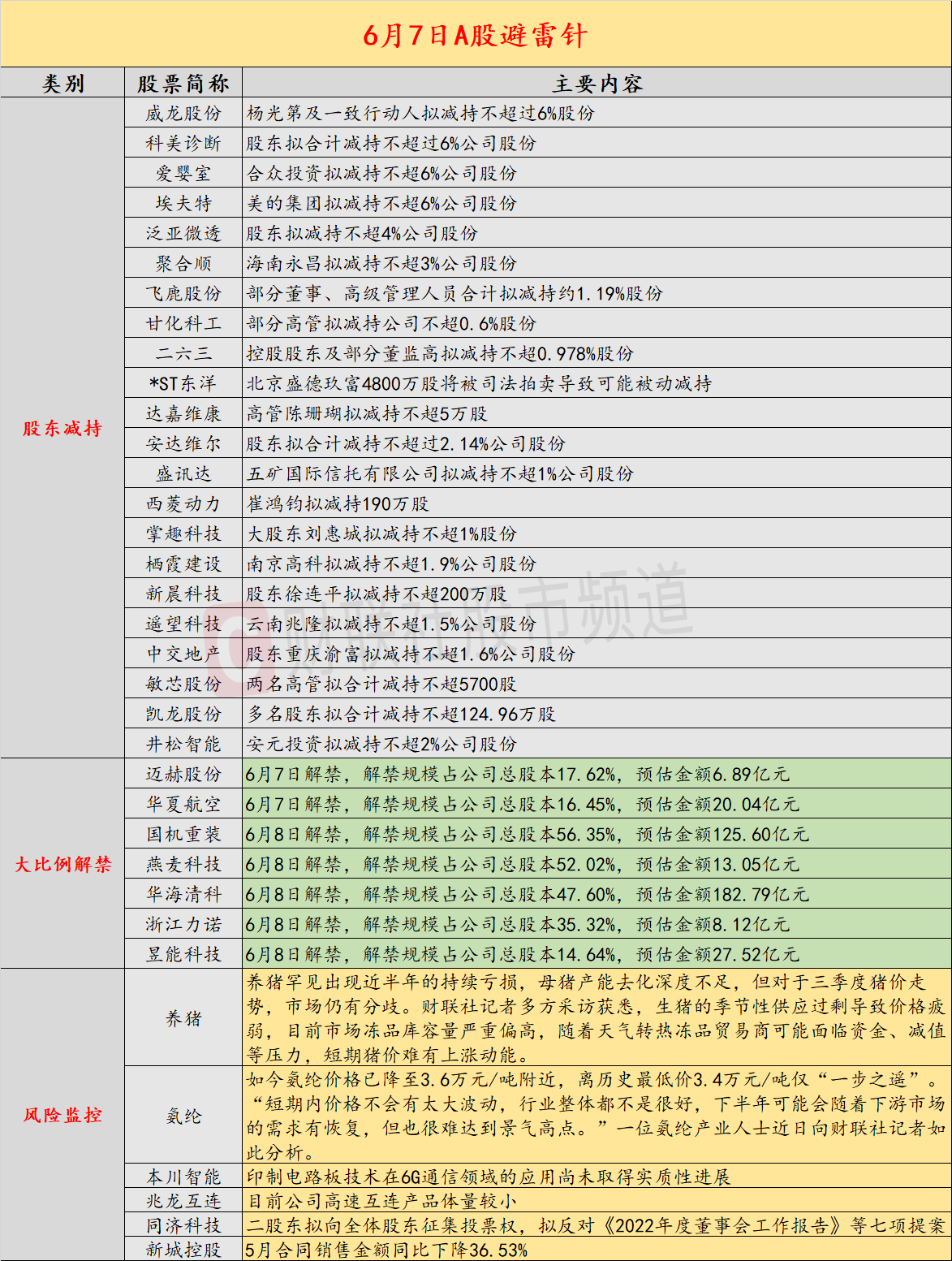 昨日A股拟减持规模较之前有所增多,威龙股份股东杨光第及一致行动人拟减持不超过6%股份,科美诊断股东拟合计减持不超过6%公司股份;国机重装、燕麦科技将迎来超五成以上解禁;北京发现两例猴痘病例;本川智能公告,印制电路板技术在6G通信领域的应用尚未取得实质性进展;养猪深陷亏损泥潭已近半年,猪价短期仍难有上涨动能;兆龙互连称目前公司高速互连产品体量较小;乌克兰大坝被毁,粮食供应担忧再起。