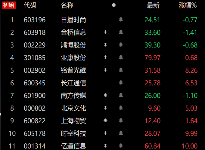 财联社6月8日电,市场焦点股日播时尚(17天10板)低开0.77%,AI+数据要素的金桥信息(16天8板)低开1.41%,算力板块鸿博股份(10天7板)低开0.68%、亚康股份(创业板3天2板)高开0.68%,光通信概念股铭普光磁(7天6板)高开8.26%、长江通信(3天2板)高开6.53%,传媒板块南方传媒(9天5板)低开1.10%、北京文化(3板)高开5.03%,从事汽车贸易的上海物贸(5天4板)高开1.64%,空间计算概念股时空科技(2板)竞价涨停、亿道信息(2板)竞价涨停。