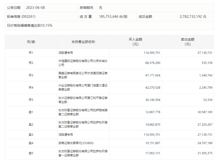财联社6月8日电,拓维信息今日涨停,深股通买入1.15亿元并卖出2714万元,中信建投北京东城分公司净买入6784万元,国盛证券宁波桑田路净买入4583万元。