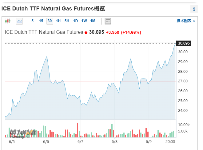 财联社6月9日电,欧洲天然气期货涨幅高达15%,至每兆瓦时31欧元。最近一周,欧洲天然气价格涨幅达35%。