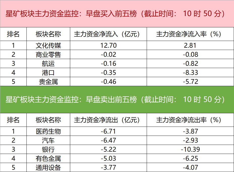 财联社6月13日电,财联社星矿数据显示,今日早盘主力资金仅净流入文化传媒板块,净流出医药生物、汽车、银行等板块,其中文化传媒板块净流入超12亿元。个股方面,三六零大涨,主力资金净买入8.63亿元,科大讯飞、天娱数科、游族网络等获主力资金净流入居前;拓维信息遭净卖出超7亿元,剑桥科技、三安光电、隆基绿能等主力资金净流出额居前。