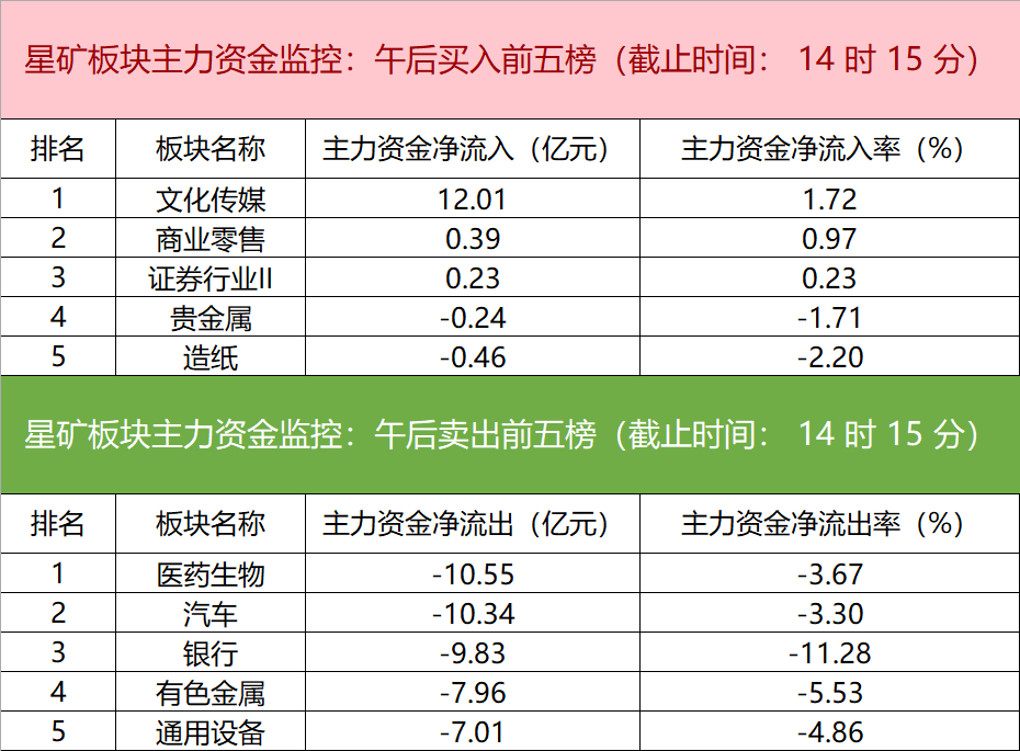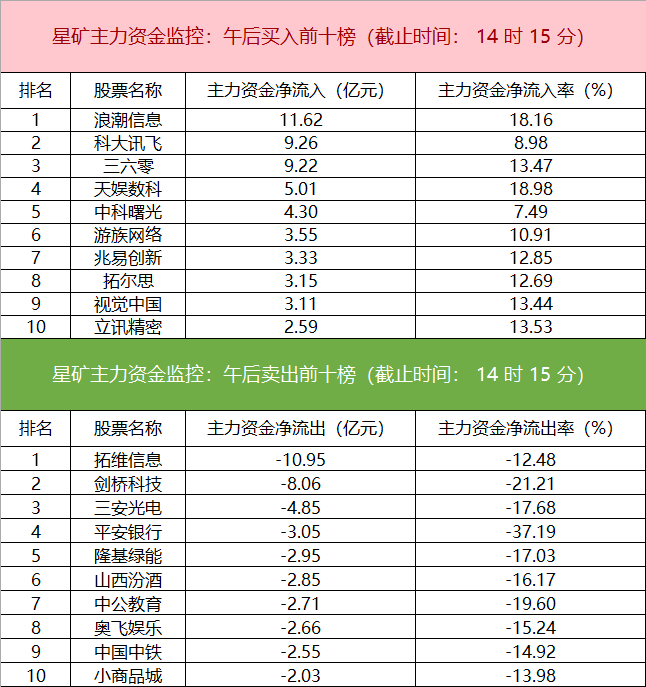 财联社6月13日电,财联社星矿数据显示,今日主力资金净流入文化传媒、商业零售、证券行业Ⅱ等板块,净流出医药生物、汽车、银行等板块,其中文化传媒板块净流入超12亿元。个股方面,浪潮信息涨停,主力资金净买入11.62亿元,科大讯飞、三六零、天娱数科等获主力资金净流入居前;拓维信息遭净卖出超10亿元,剑桥科技、三安光电、平安银行等主力资金净流出额居前。