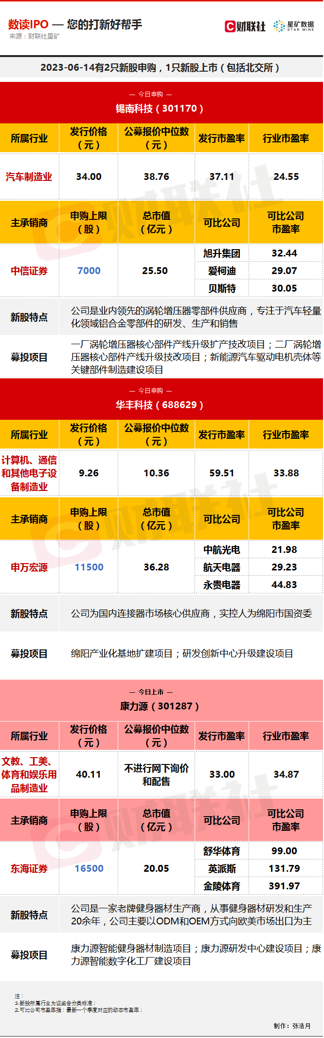 财联社6月14日电,今日2只新股申购,分别为创业板的锡南科技,科创板的华丰科技;1只新股上市,为创业板的康力源。