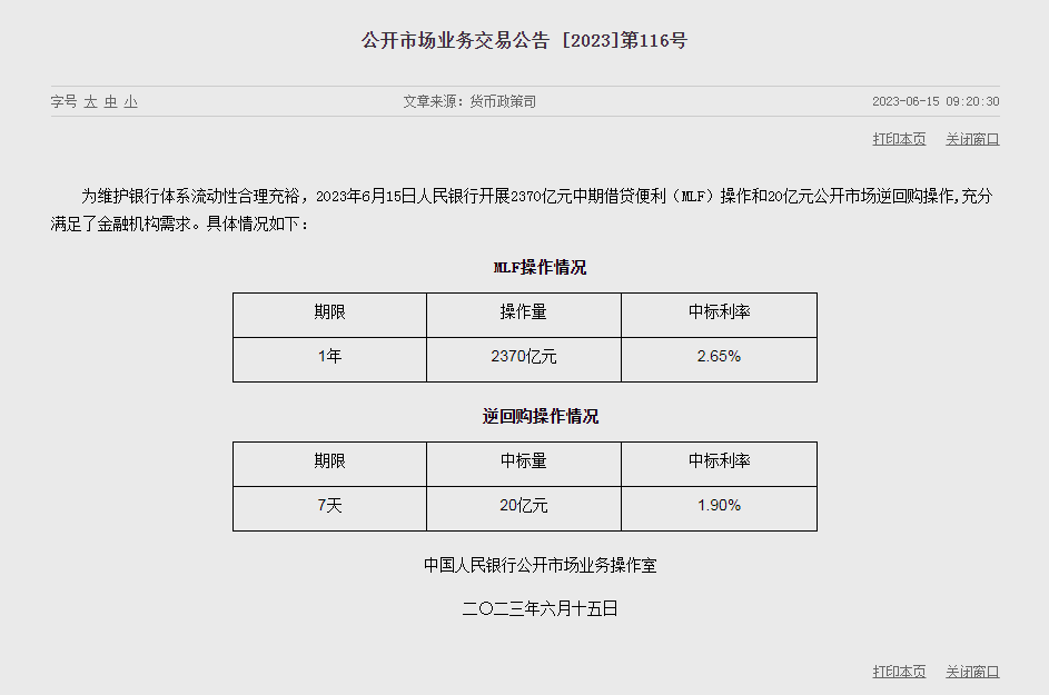 财联社6月15日电,央行公开市场开展20亿元7天期逆回购操作和2370亿元1年期MLF操作,中标利率分别为1.9%、2.65%,此前分别为1.9%、2.75%。今日有20亿元逆回购和2000亿元MLF到期。