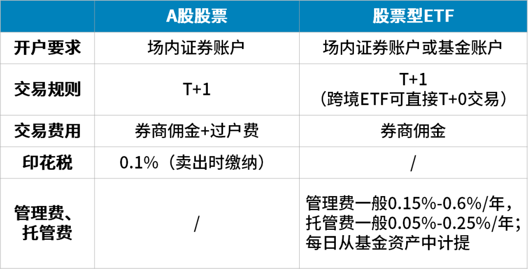 ETF是指数基金,其份额可在证券交易所上市交易,投资者可如买卖股票那样买卖ETF份额(且免印花税、过户费),获得与标的指数基本相同的回报率,因此,ETF也常被称为“大股票”。在二级市场参与A股股票和股票型ETF投资要素对比