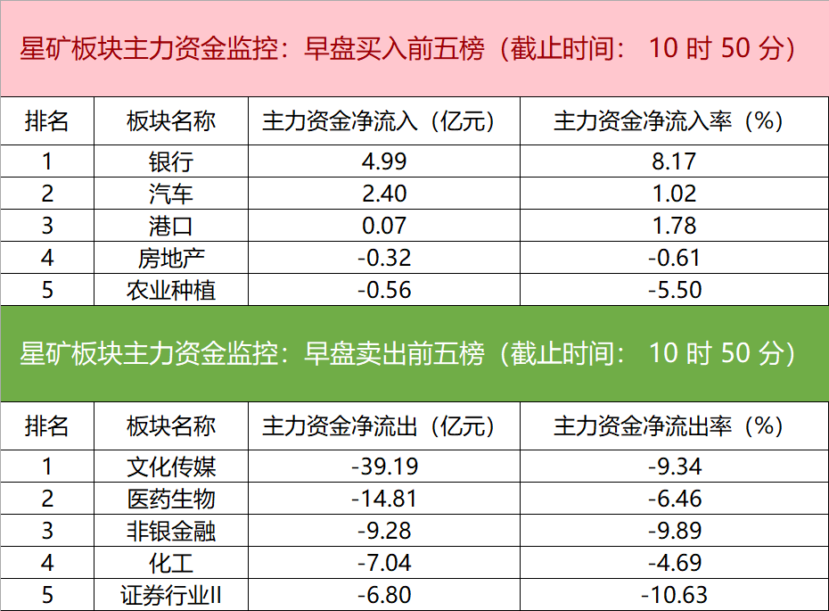 财联社6月21日电,财联社星矿数据显示,今日早盘主力资金净流入银行、汽车、港口等板块,净流出文化传媒、医药生物、非银金融等板块,其中文化传媒板块净流出超39亿元。个股方面,N国科大涨,主力资金净买入3.25亿元,景嘉微、N威士顿、焦点科技获主力资金净流入居前;三六零遭净卖出超7亿元,昆仑万维、中科曙光、药明康德主力资金净流出额居前。