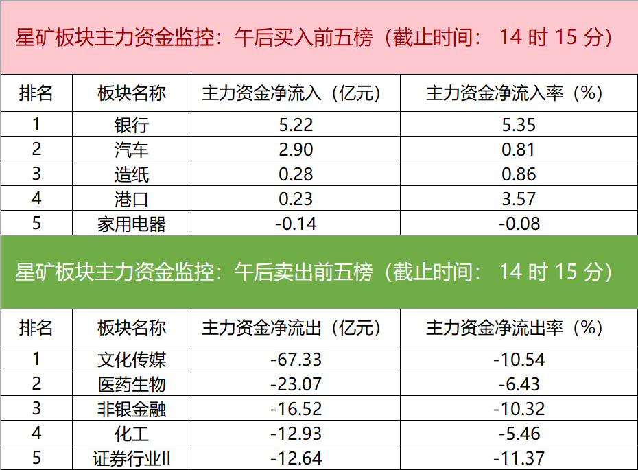 财联社6月21日电,财联社星矿数据显示,今日主力资金净流入银行、汽车、造纸等板块,净流出文化传媒、医药生物、非银金融等板块,其中文化传媒板块净流出超67亿元。个股方面,N国科大涨,主力资金净买入3.89亿元,景嘉微、中国石油、N威士顿等获主力资金净流入居前;昆仑万维遭净卖出超13亿元,三六零、中科曙光、药明康德等主力资金净流出额居前。