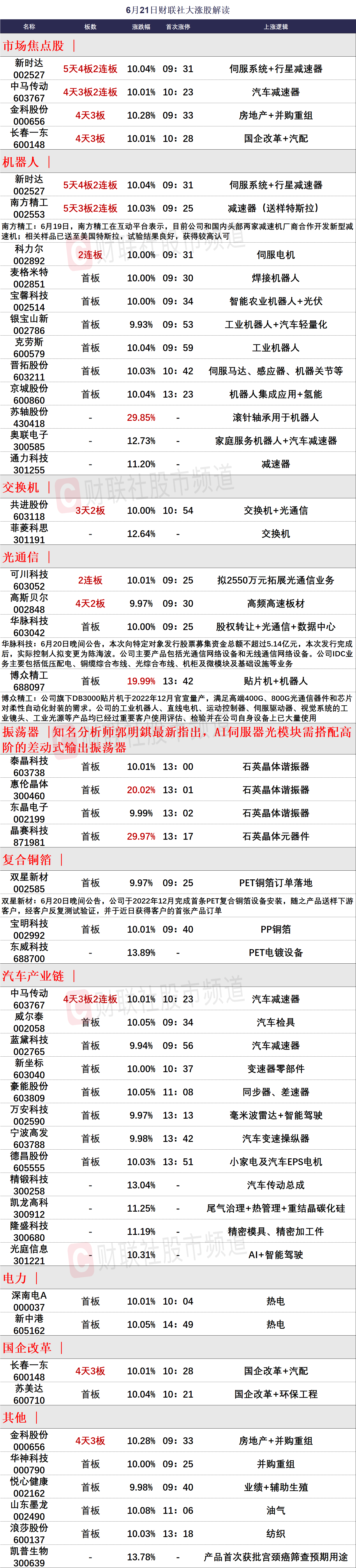今日共37股涨停,连板股总数5只,17股封板未遂,封板率为68%(不含ST股、退市股及未开板新股)。个股方面,机器人概念股新时达5天4板、南方精工5天3板、科力尔2板,汽车产业链的中马传动4天3板、长春一东4天3板,并购重组的金科股份4天3板,光通信板块可川科技2板、高斯贝尔4天2板,振荡器概念股惠伦晶体创业板首板、晶赛科技北交所首板,交换机概念股共进股份3天2板。今日收涨个股817只,收跌个股4079只。
