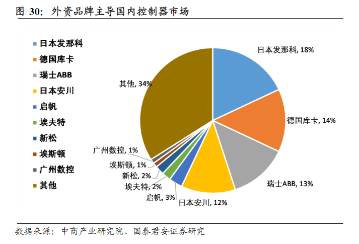 美日韩等外资厂商以机器人控制器核心技术,率先占据国内工业机器人控制器市场的绝大部分份额。全球行业龙头——日本发那科在中国市场份额为18%,稳居第一宝座。国内企业控制器尚未形成市场竞争力,工业机器人控制器国产率不足20%。
