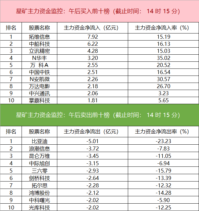 主力资金监控:比亚迪净卖出超5亿元