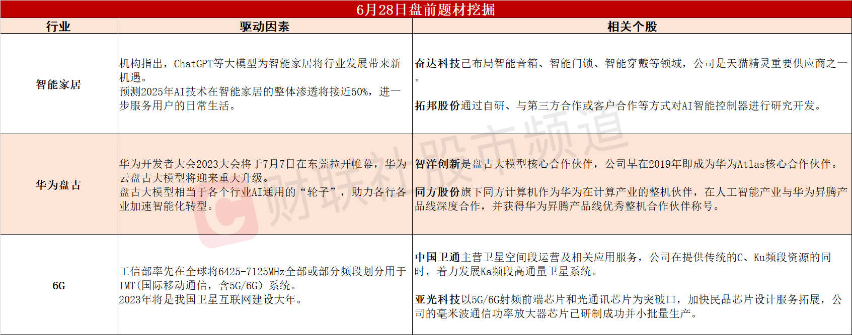 ①AI为智能家居行业发展带来新机遇,2025年AI在行业渗透率或近50%。②华为盘古大模型将迎重大升级,产业链公司有望深度受益。③工信部将6GHz频段划分用于5G/6G系统,我国或迎6G建设大年。