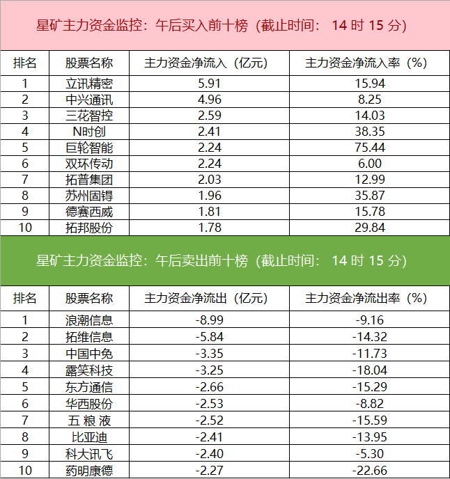 财联社6月29日电,财联社星矿数据显示,今日主力资金净流入通用设备、文化传媒、出版等板块,净流出化工、非银金融、汽车整车等板块,其中化工板块净流出10.06亿元。个股方面,立讯精密大涨,主力资金净买入5.91亿元,中兴通讯、三花智控、N时创等获主力资金净流入居前;浪潮信息遭净卖出超8亿元,拓维信息、中国中免、露笑科技等主力资金净流出额居前。