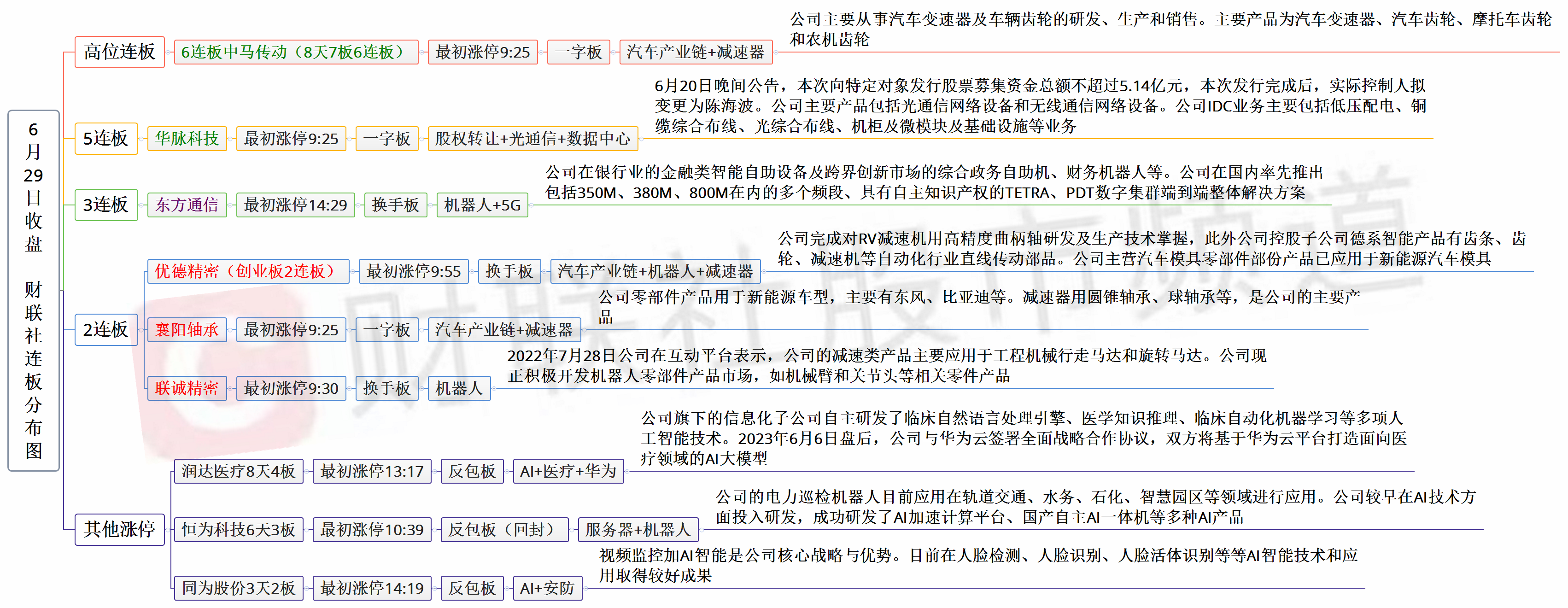 今日共54股涨停,连板股总数6只,其中三连板及以上个股3只,上一交易日共7只连板股,连板股晋级率42%(不含ST股、退市股及未开板新股)。个股方面,市场情绪仍在恢复中,虽然中马传动直接缩量一字涨停晋级6连板,拓展了市场高度,但排除一字涨停个股,市场最终晋级成功的连板股仅有东方通信、优德精密、联诚精密3只。板块方面,中马传动超预期一字涨停带动机器人(及其减速器、传感器分支)走强,板块内优德精密、华研精机等6只20CM涨停,还有北交所泰德股份30CM涨停,板块人气爆棚,甚至带动了汽配、稀土永磁等相关板块上涨。不过值得注意的是板块午后回落,热门标的中大力德、江苏雷利回落幅度超10%,极大地影响了风险偏好。