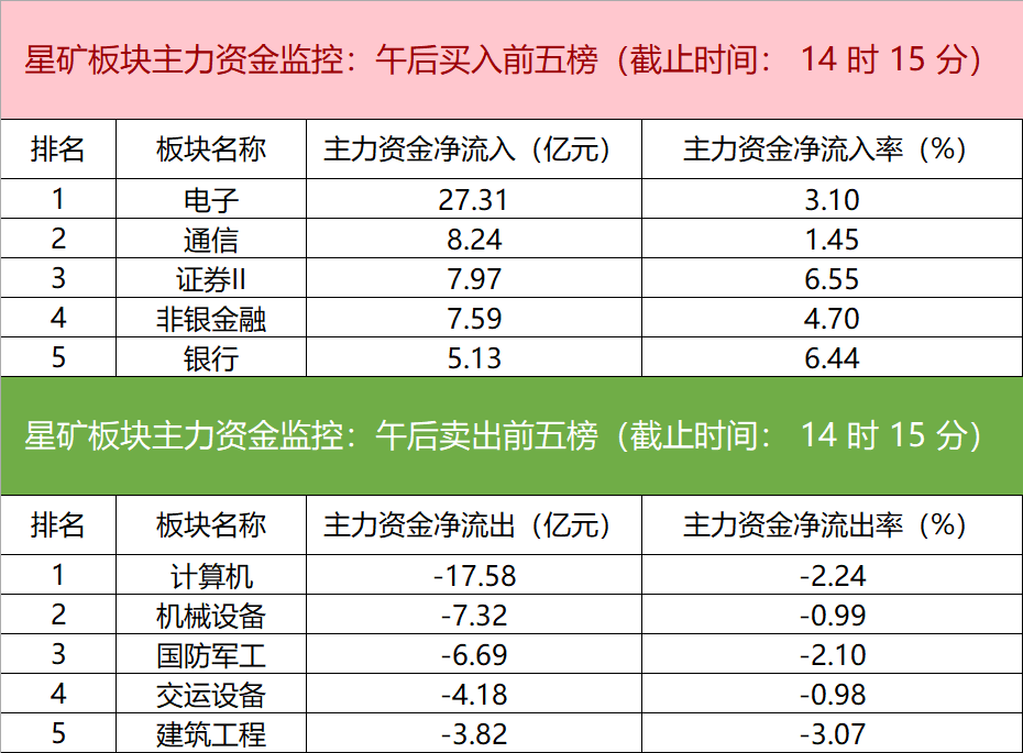 财联社6月30日电,财联社星矿数据显示,今日主力资金净流入电子、通信、证券Ⅱ等板块,净流出计算机、机械设备、国防军工等板块,其中电子板块净流入27.31亿元。个股方面,N芯动大涨,主力资金净买入7.13亿元,沪电股份、宁德时代、新易盛等获主力资金净流入居前;隆基绿能遭净卖出超5亿元,科大讯飞、昆仑万维、拓尔思等主力资金净流出额居前。