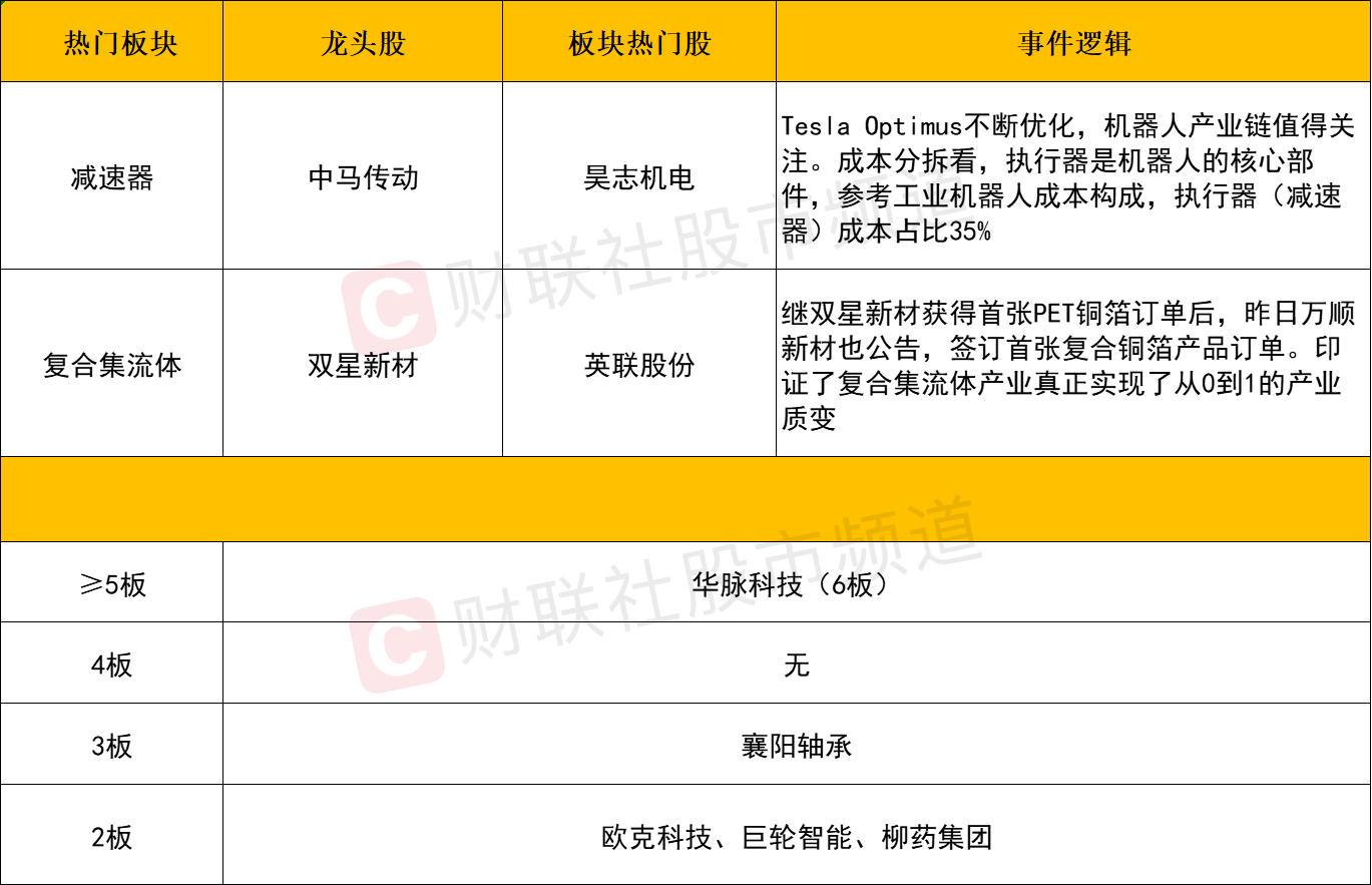 今日机器人概念股延续强势,高标龙头中马传动再度涨超6%(尾盘一度再度触及涨停9天8板),襄阳轴承3连板、巨轮智能2连板。此外昨日尾盘阶段跳水的中大力德今日反包涨停而南方精工同样涨超5%。在经历了机器人产业链昨日全面爆发后,前排核心标的依旧能够获得了资金的接力,在此背景下,对于本轮机器人行情的延续性或或更为值得期待。若想参与机器人的投资者,后续仍可持续留意前期高标的盘中回踩机会进行短线博弈或者重点关注产业链被新晋挖掘细分的补涨机会。