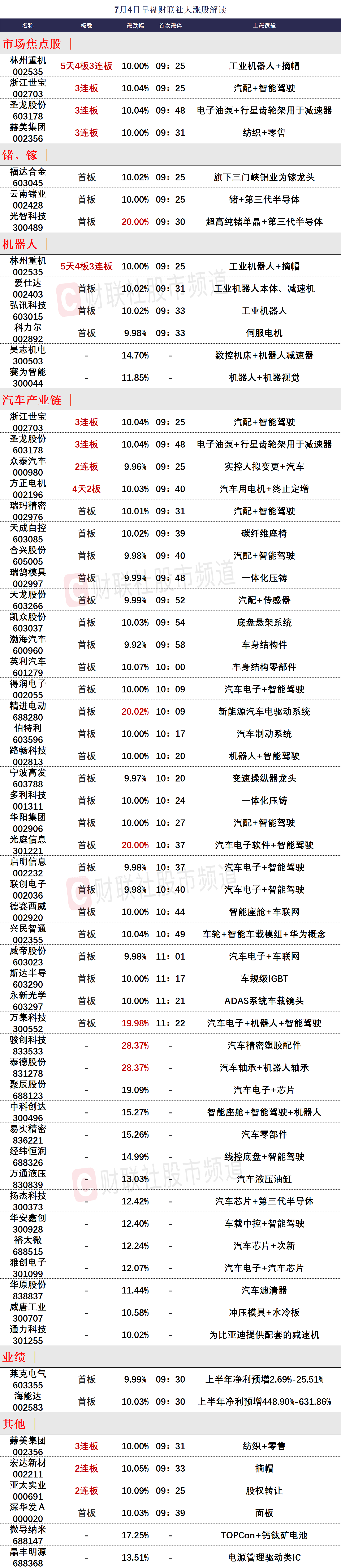 今日午盘两市共41股涨停,连板股总数7只,15股封板未遂,封板率为73%(不含ST股、退市股及未开板新股)。个股方面,机器人+摘帽的林州重机5天4板,汽车产业链的浙江世宝3板、圣龙股份3板、众泰汽车2板、方正电机4天2板,纺织+零售的赫美集团3板。