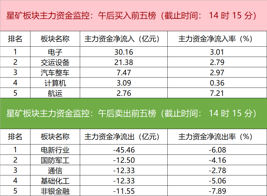 财联社7月4日电,财联社星矿数据显示,今日主力资金净流入电子、交运设备、汽车整车等板块,净流出电新行业、国防军工、通信等板块,其中电新行业净流出45.46亿元。个股方面,长安汽车上涨,主力资金净买入5.01亿元,N豪恩、比亚迪、江淮汽车等获主力资金净流入居前;中船科技遭净卖出超3亿元,中国船舶、中兴通讯、中通客车等主力资金净流出额居前。