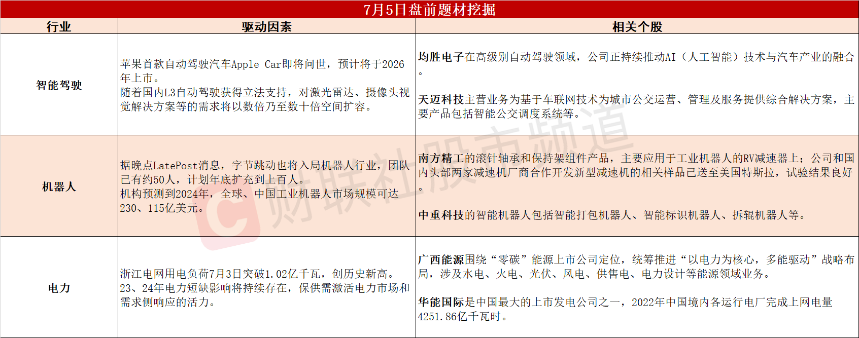 ①苹果首款自动驾驶汽车即将问世,L3级标准大幅提高软硬件升级需求。②字节跳动也将入局机器人,机构预测明年行业规模超百亿美元。③江浙两省用电负荷突破1亿千瓦,电力供需偏紧情况或持续存在。