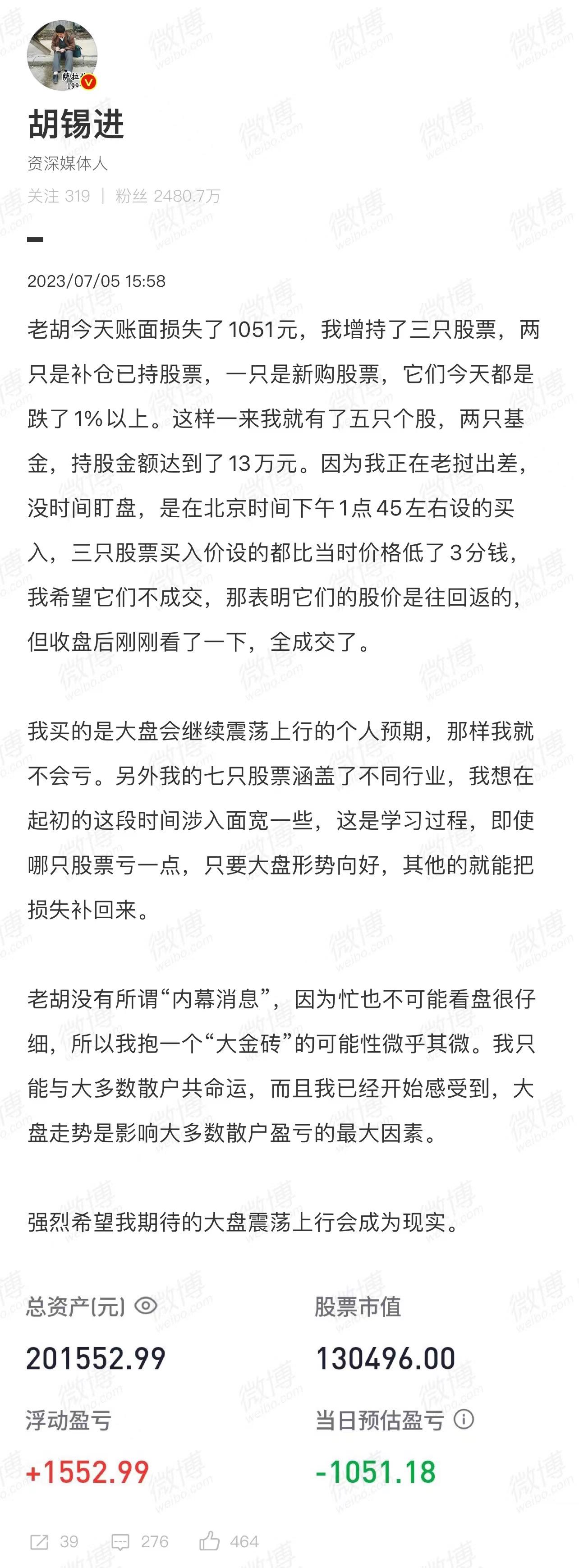 财联社7月5日电,胡锡进在微博发文称,“老胡今天账面损失了1051元,我增持了三只股票,两只是补仓已持股票,一只是新购股票,它们今天都是跌了1%以上。这样一来我就有了五只个股,两只基金,持股金额达到了13万元。因为我正在老挝出差,没时间盯盘,是在北京时间下午1点45左右设的买入,三只股票买入价设的都比当时价格低了3分钱,我希望它们不成交,那表明它们的股价是往回返的,但收盘后刚刚看了一下,全成交了。”