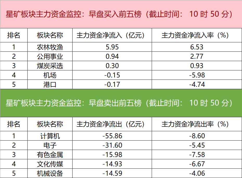 财联社7月7日电,财联社星矿数据显示,今日早盘主力资金净流入农林牧渔、公用事业、煤炭采选等板块,净流出计算机、电子、有色金属等板块,其中计算机板块净流出超55亿元。个股方面,中际旭创上涨,主力资金净买入3.72亿元,农发种业、京东方A、N致尚获主力资金净流入居前;拓维信息遭净卖出超12亿元,中科曙光、众泰汽车、寒武纪主力资金净流出额居前。