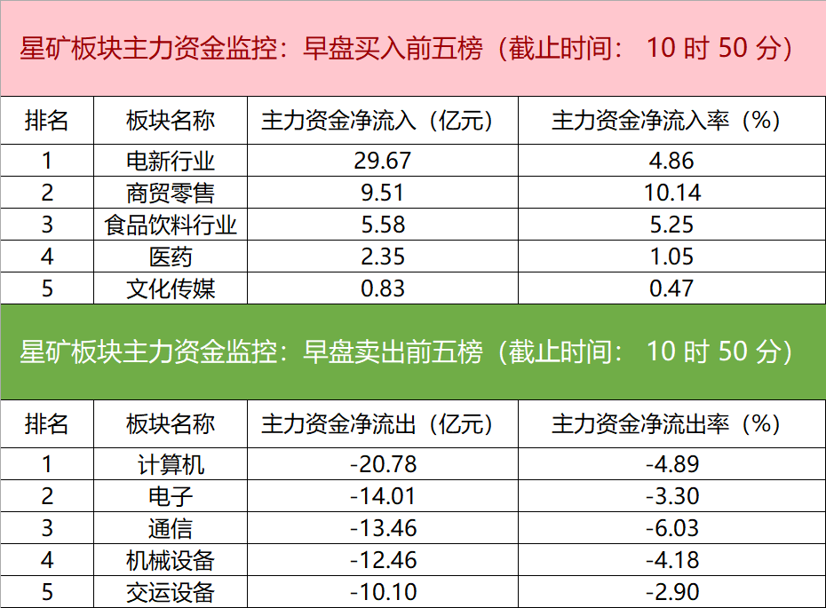 财联社7月10日电,财联社星矿数据显示,今日早盘主力资金净流入电新行业、商贸零售、食品饮料行业等板块,净流出计算机、电子、通信等板块,其中电新行业净流入超29亿元。个股方面,隆基绿能大涨,主力资金净买入14.89亿元,中国中免、N天承、宁德时代获主力资金净流入居前;科大讯飞遭净卖出超5亿元,中际旭创、浪潮信息、华工科技主力资金净流出额居前。