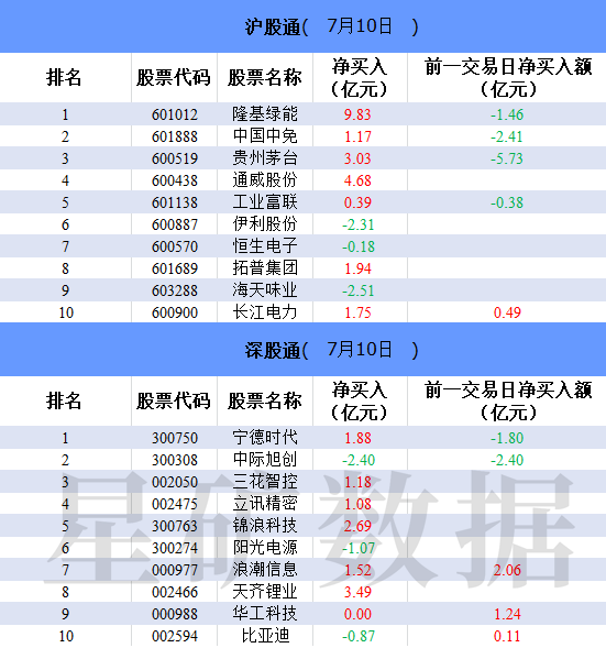 财联社7月10日电,北向资金净买入12.3亿元,终结连续4日净卖出。隆基绿能、通威股份、天齐锂业分别获净买入9.83亿元、4.68亿元、3.49亿元。海天味业净卖出额居首,金额为2.51亿元。