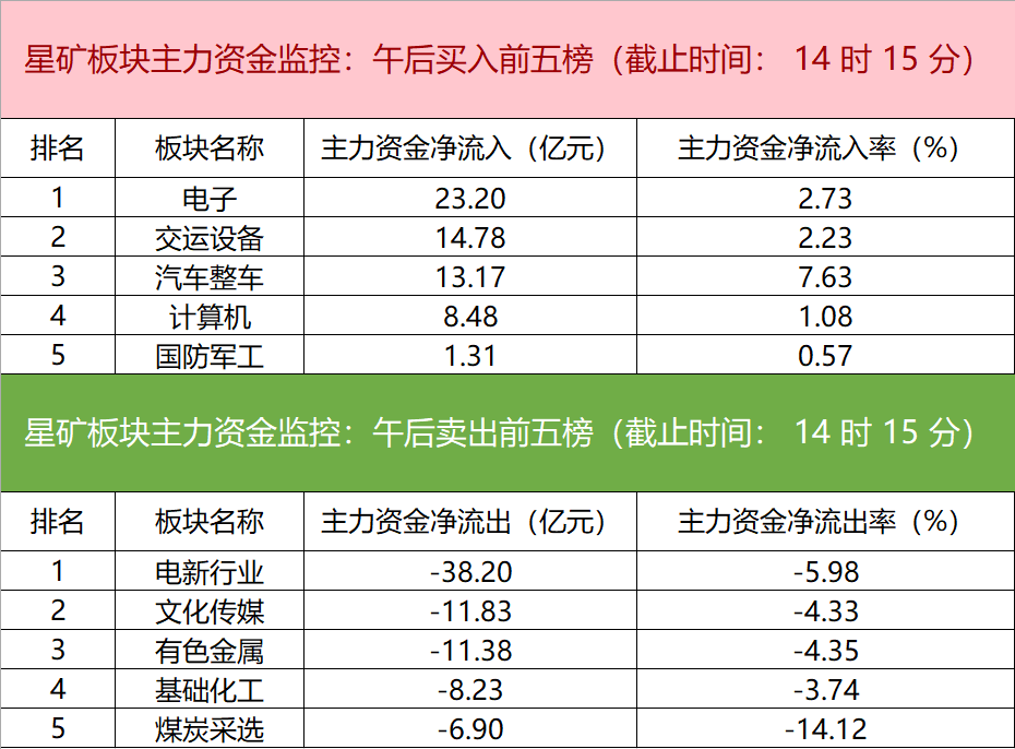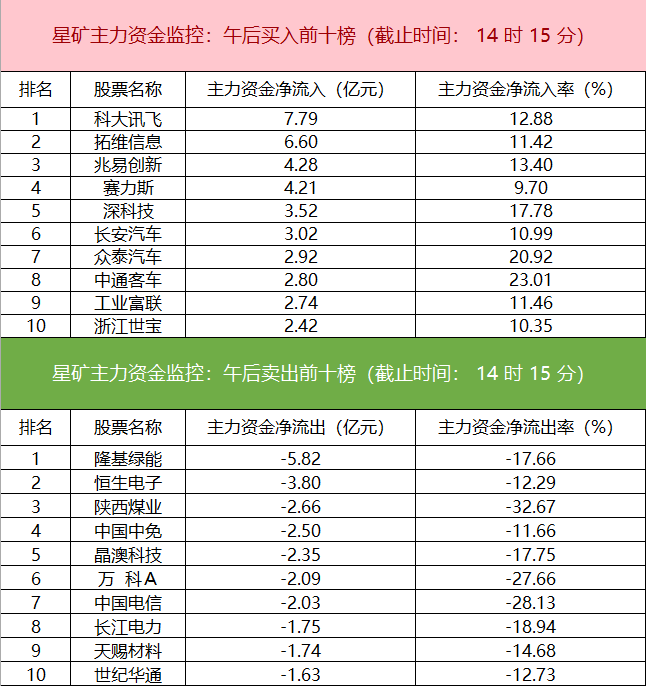 财联社7月11日电,财联社星矿数据显示,今日主力资金净流入电子、交运设备、汽车整车等板块,净流出电新行业、文化传媒、有色金属等板块,其中电新行业净流出38.20亿元。个股方面,科大讯飞上涨,主力资金净买入7.79亿元,拓维信息、兆易创新、赛力斯等获主力资金净流入居前;隆基绿能遭净卖出超5亿元,恒生电子、陕西煤业、中国中免等主力资金净流出额居前。
