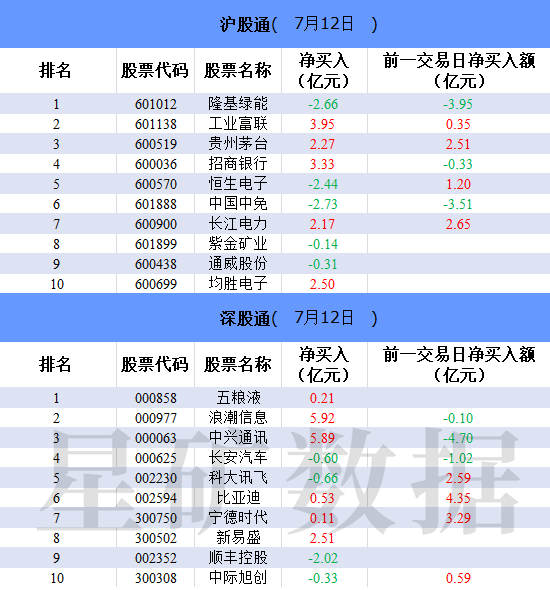 财联社7月12日电,北向资金净买入4.95亿元,连续3日加仓。浪潮信息、中兴通讯、工业富联分别获净买入5.92亿元、5.89亿元、3.95亿元。中国中免净卖出额居首,金额为2.73亿元。