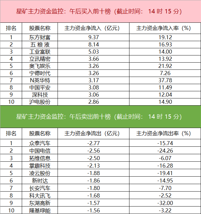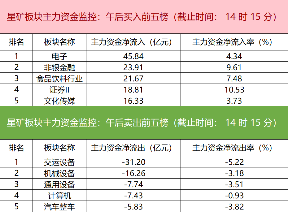 财联社7月13日电,财联社星矿数据显示,今日主力资金净流入电子、非银金融、食品饮料行业等板块,净流出交运设备、机械设备、通用设备等板块,其中电子板块净流入45.84亿元。个股方面,东方财富上涨,主力资金净买入9.37亿元,五粮液、工业富联、立讯精密获主力资金净流入居前;众泰汽车遭净卖出超2亿元,中国电信、拓维信息、掌趣科技等主力资金净流出额居前。