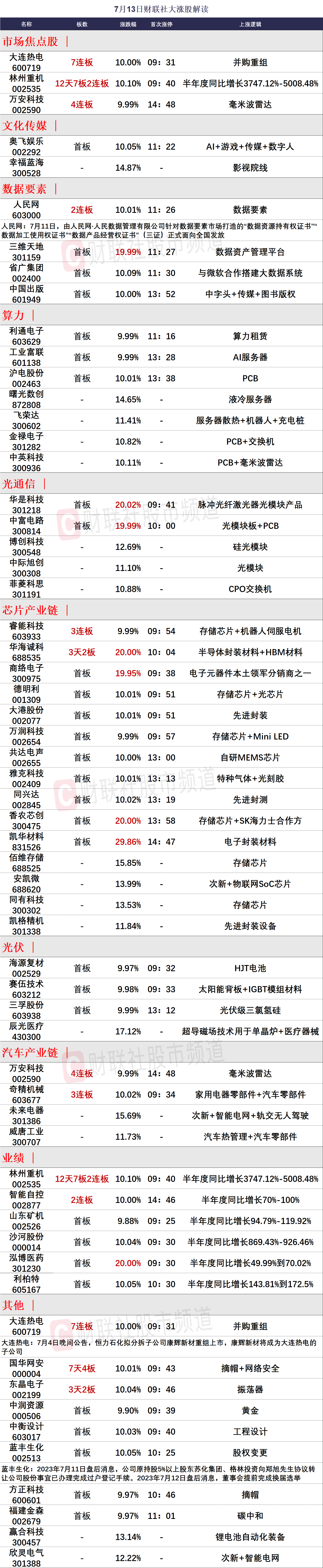 今日共40股涨停,连板股总数7只,17股封板未遂,封板率为70%(不含ST股、退市股及未开板新股)。个股方面,并购重组的大连热电7板,业绩超预期的林州重机12天7板、智能自控2板,汽车产业链的万安科技4板、奇精机械3板,摘帽+网络安全的国华网安7天4板,芯片产业链的睿能科技3板、华海诚科科创板3天2板,数据要素板块人民网2板、三维天地创业板首板,PCB+光通信的中富电路创业板首板。今日收涨个股3775只,收跌个股1083只。