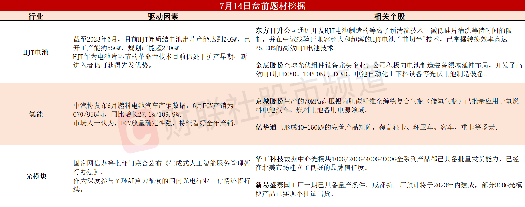 ①产业降本技术有望超预期落地,HJT成大厂抢跑扩产首选。②史上首次FCV单月产销接近千辆,燃料电池市场爆发确定性高。③七部门发布《生成式人工智能服务管理暂行办法》,算力配套建设有望加速。
