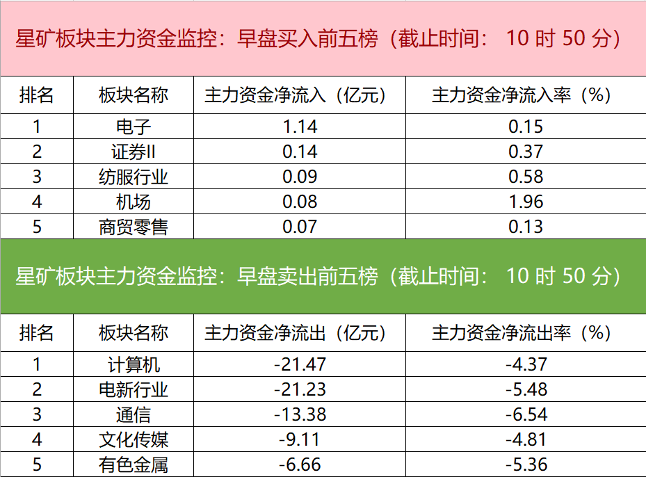 财联社7月18日电,财联社星矿数据显示,今日早盘主力资金净流入电子、证券Ⅱ、纺服行业等板块,净流出计算机、电新行业、通信等板块,其中计算机板块净流出超21亿元。个股方面,浪潮信息上涨,主力资金净买入5.82亿元,N精智达、通富微电、晶方科技获主力资金净流入居前;寒武纪遭净卖出超2亿元,榕基软件、工业富联、隆基绿能主力资金净流出额居前。