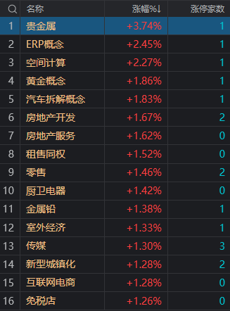 财联社7月19日电,大盘全天震荡分化,沪指探底回升,创业板指跌超1%。盘面上,房地产板块午后走强,粤宏远A、荣盛发展涨停。零售股继续活跃,中央商场4连板,人人乐涨停。AI概念股早盘反弹,奥飞娱乐、南方传媒、省广集团涨停。黄金概念股震荡走强,四川黄金涨停。整体上市场热点仍呈现快速轮动冲高回落的特征。下跌方面,3D打印概念股继续调整,金太阳跌超10%。总体上个股跌多涨少,两市超2600只个股下跌。沪深两市今日成交额7024亿,较上个交易日缩量747亿。板块方面,贵金属、房地产、零售、传媒等板块涨幅居前,3D打印、国防军工、OLED、光刻胶等板块跌幅居前。截至收盘,沪指涨0.03%,深成指跌0.37%,创业板指跌1.06%。北向资金全天净卖出49.32亿元,其中沪股通净卖出39.6亿元,深股通净卖出9.72亿元。