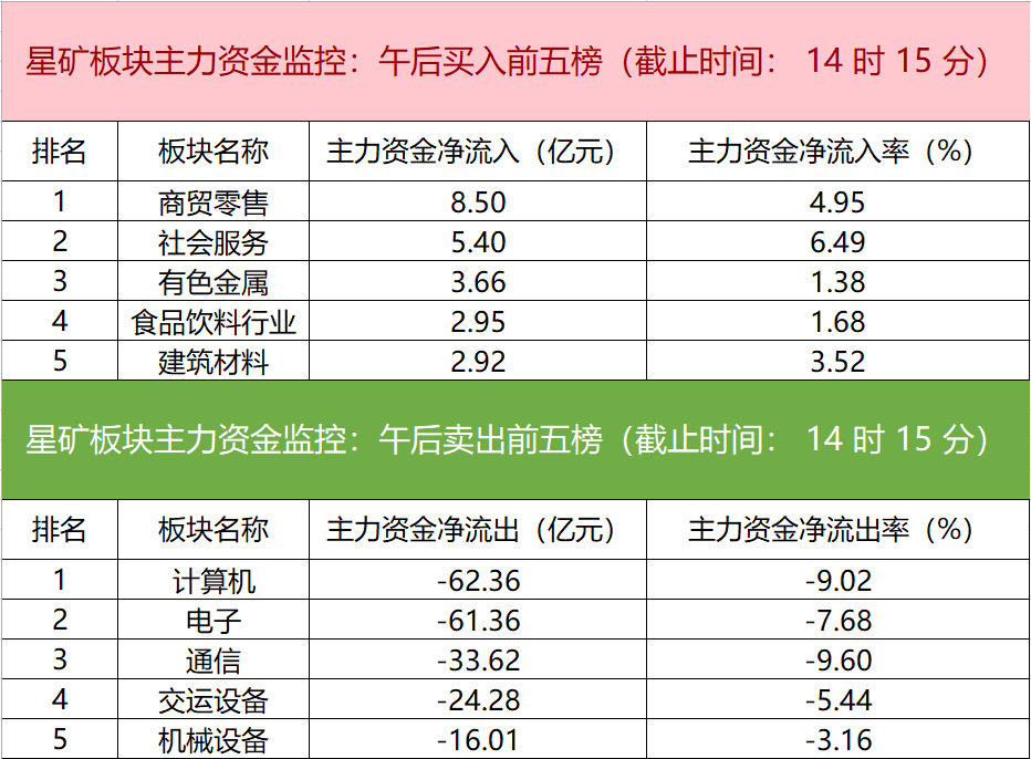 财联社7月20日电,财联社星矿数据显示,今日主力资金净流入商贸零售、社会服务、有色金属等板块,净流出计算机、电子、通信等板块,其中计算机板块净流出62.36亿元。个股方面,西安饮食涨停,主力资金净买入4.41亿元,省广集团、N智信、亚威股份获主力资金净流入居前;华工科技遭净卖出超8亿元,中际旭创、科大讯飞、工业富联等主力资金净流出额居前。