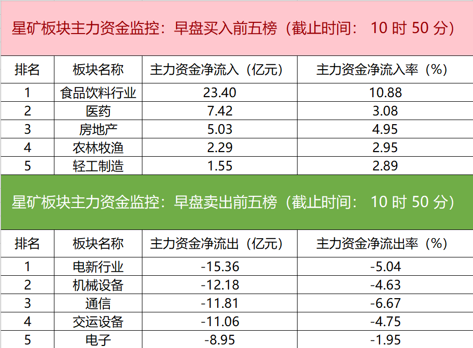 财联社7月21日电,财联社星矿数据显示,今日早盘主力资金净流入食品饮料行业、医药、房地产等板块,净流出电新行业、机械设备、通信等板块,其中食品饮料行业净流入超23亿元。个股方面,贵州茅台上涨,主力资金净买入6.93亿元,金桥信息、五粮液、通富微电获主力资金净流入居前;中际旭创遭净卖出超3亿元,新易盛、省广集团、西安饮食主力资金净流出额居前。